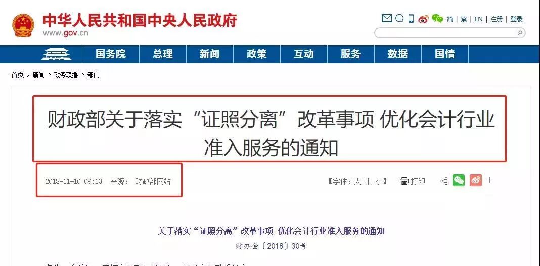 2018年11月9日,财政部公布发布《关于落实“证照分离”改革事项 优化会计行业准入服务的通知》,提到将会计师事务所及分支机构设立审批、代理记账业务审批列为第一批全国推开“证照分离”改革的事项。